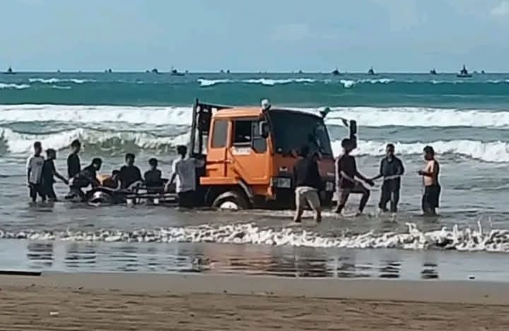 Truk Wisatawan Nyaris Ditelan Laut Pasang di Pantai Bagedur